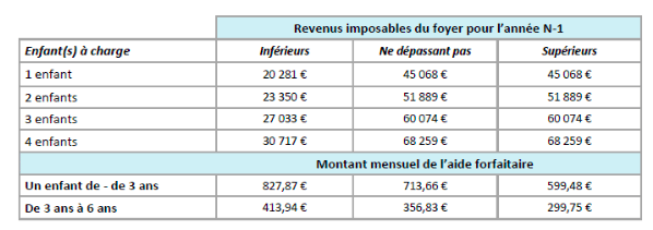 Encore une fois, le revenu de l’année n-1 est pris en compte pour le calcul, avec un montant accru pour les familles monoparentales.